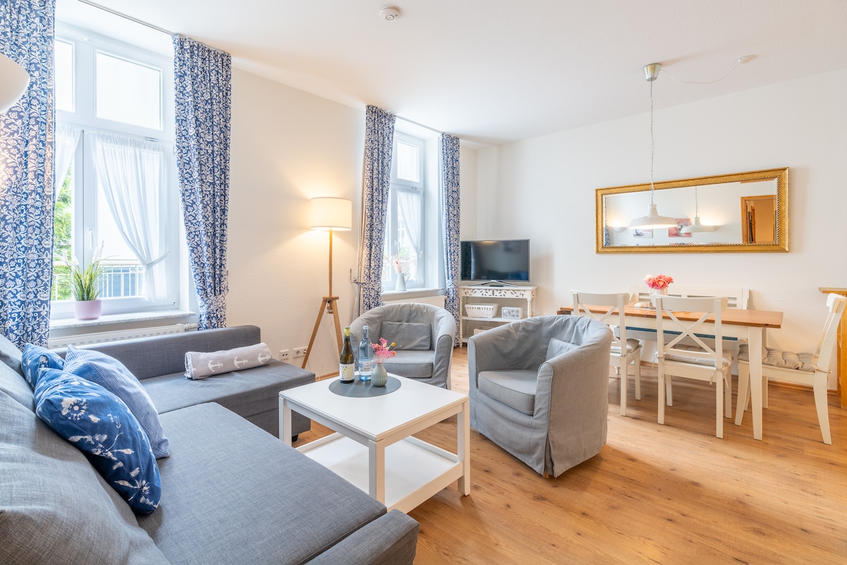 ALTE BUCHDRUCKEREI (Bäderarchitektur, denkmalgeschützt) - eine strandnahe, individuell eingerichtete 92,5qm-Ferienwohnung über 2 Etagen, mit 2 Schlafzimmern (1x mit Doppelbett 1,80m und 1x mit Bett 1,40m). Im EG befindet sich eine komplett ausgestattete Küche und das Esszimmer. Eine Sitzecke im sonnigen Vorgarten gehört ebenfalls zur Wohnung. Im OG ist der wintergartenähnlichem Verandenvorbau hervorzuheben. Dieser lässt sich durch Vertikalschiebefenster öffnen und wie eine Loggia nutzen.