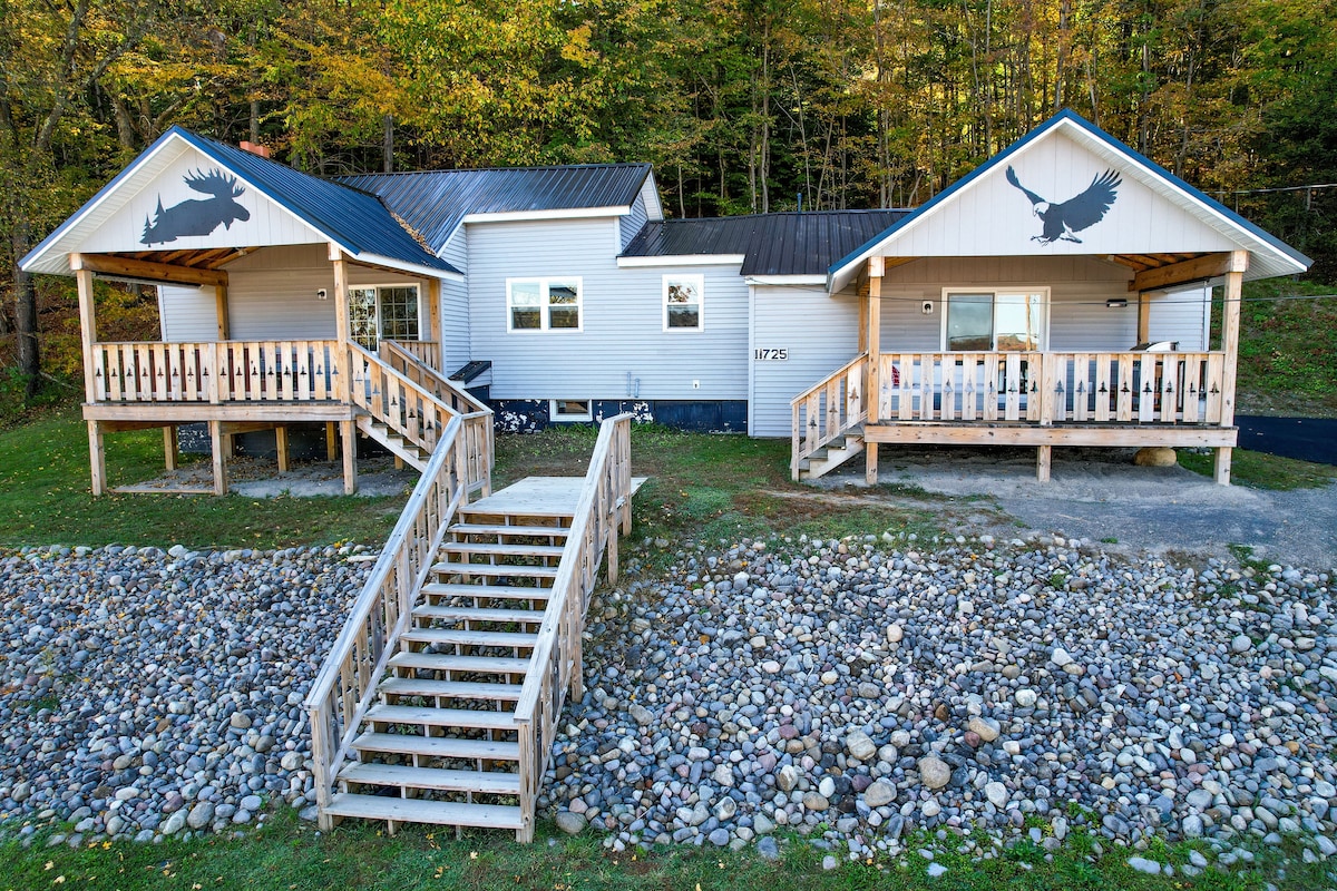 Soak in the Adirondacks from this rustic, newly remodeled one-bed apartment with a king size bed, full kitchen and bathroom. Start your day with a beautiful view of the sunrise over the Moose River. Feel free to launch one of our kayaks from our private dock, watch the stars from the hot tub or by the fire pit, take a bike ride on our bikes or just watch the amazing wild life and sunset from your private deck. Close to restaurants, shopping, hiking, and all of the summertime fun in Old Forge.