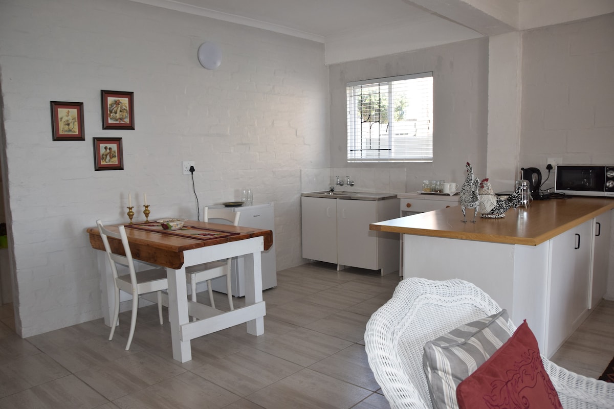 A light, airy private room which offers parking at the door, a private patio and private entrance. This unit has a bathroom, a good shower, kitchenette with kettle, toaster, microwave and fridge. Provided is tea, coffee, coffee plunger for filter coffee, milk and sugar. UPS (uninterrupted power supply) for WIFI during loadshedding. It is a few minutes drive from the center of town and is in a peaceful security estate, with walkways flanked with fynbos, and panoramic sea views at the top.
