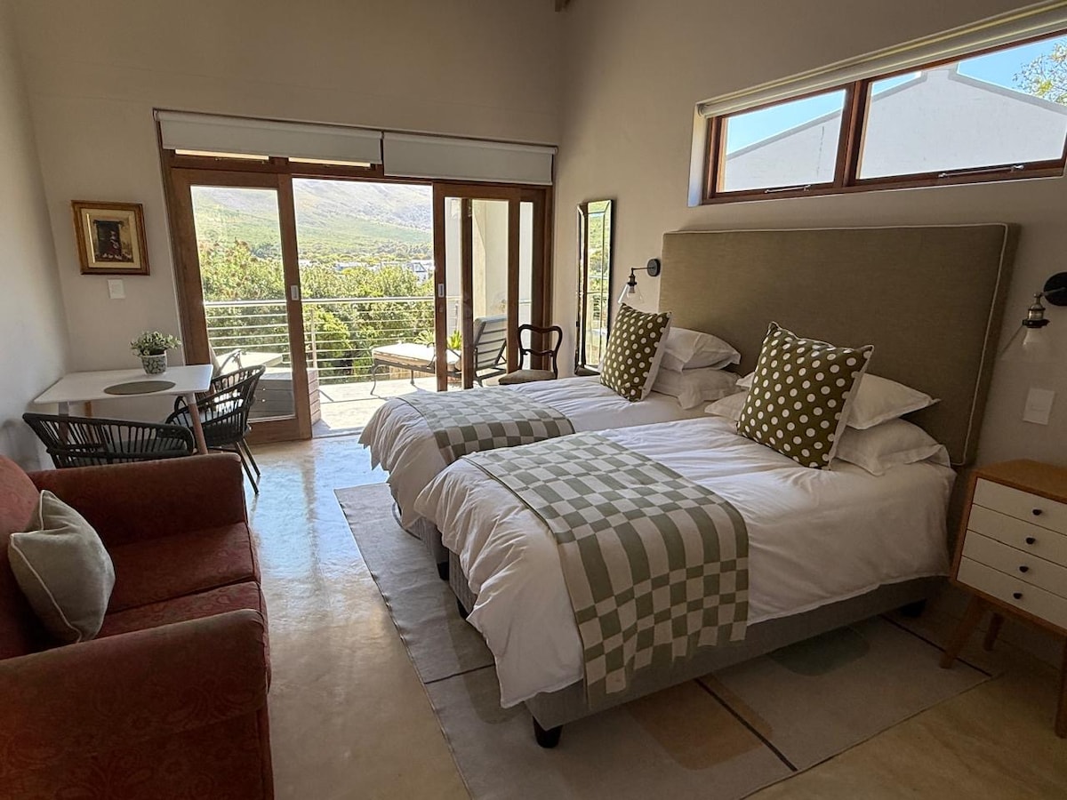Escape to The Studio Room, a private retreat in Hermanus with its own entrance and staircase. Unwind on the sunny deck with loungers, BBQ, and mountain view. This open-plan space blends cosy sleeping, dining, and kitchenette areas, while the bathroom (bath & shower) is private with a door. Enjoy modern comforts like air-con, Wi-Fi, DSTV, and a Nespresso. Perfect for couples seeking peace and privacy. No children under 12. Kitchenette has: Toaster, kettle, mini oven with grill, & a fridge.