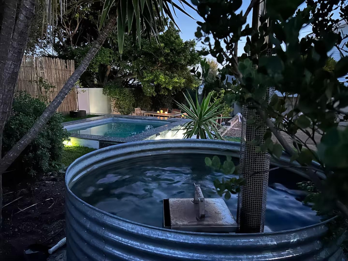 Cosy and light two bedroom cottage on the premises of one of the original old houses in Onrus - surrounded by local cafe's and restaurants. You will find yourself in a buzzing little neighbourhood, spoiled for choice with all the local eateries, coffee shops and deli’s - conveniently situated with a 8 minute walk to the main beach. The kitchen and lounge are open planned with a fireplace and an outdoor braai on the covered veranda. Suitable for 2 couples, single travellers or a small family.