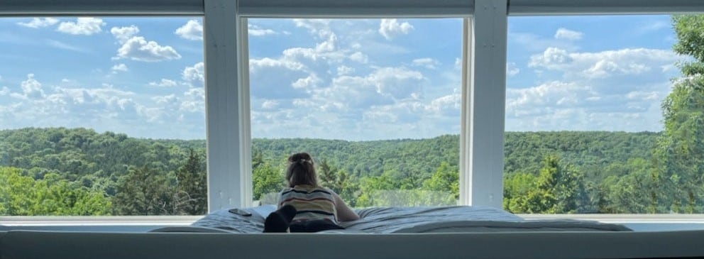 Welcome to our charming boho-inspired Grain Bin Cabin, the Highland is ideal for 2-3 adults or 2 adults and 2 smaller children. Upstairs, you'll find a comfortable king bed in the loft, while downstairs features a cozy futon in the main living space. The full kitchen is equipped with everything you need. Full Bath with a walk-in shower downstairs. Experience a serene countryside getaway with breathtaking sunsets and peaceful surroundings, just moments away from Versailles.