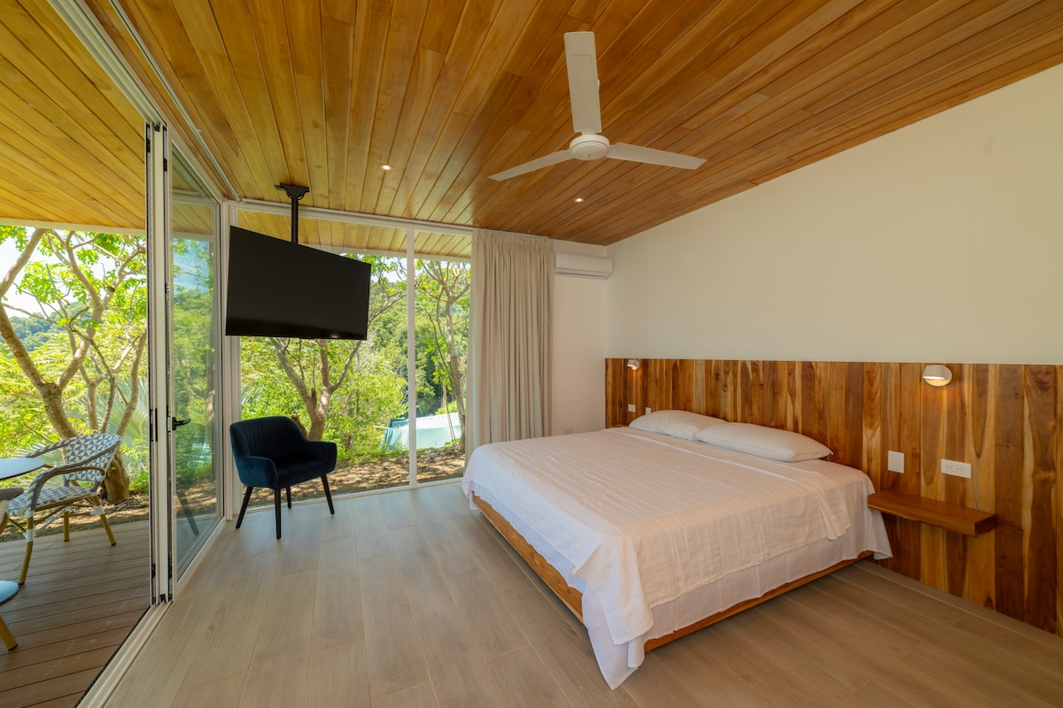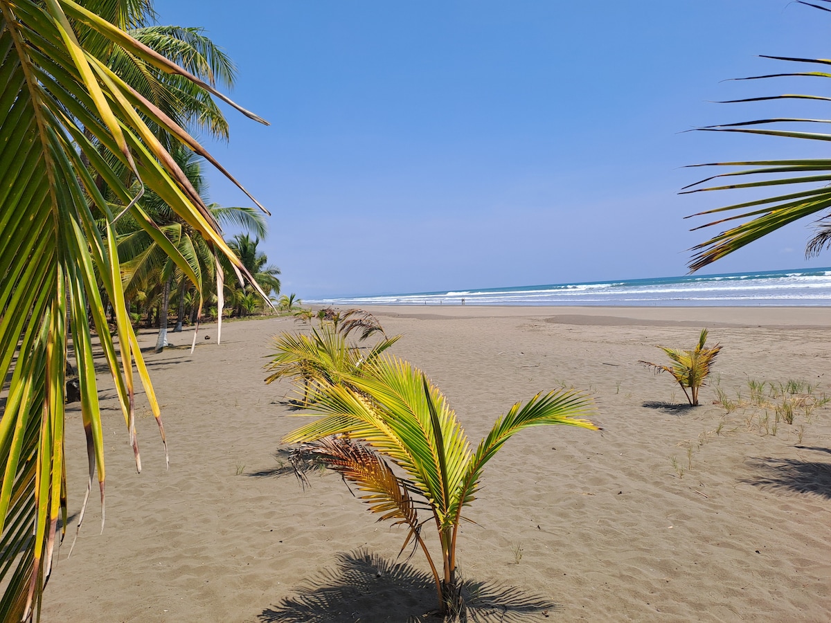 Welcome to our beautiful beach bungalow in Playa Hermosa, Jacó ☆SECOND FLOOR APARTMENT.— your dream vacation spot! Prime location right in front of one of Hermosa’s best surf points, with ocean views from the terrace. Enjoy your coffee with exotic birds, relax in a hammock, and walk just steps to the beach. Inside, you'll find white and earthy tones, custom-designed furniture, and the peaceful sleep you need to wake up renewed and ready for pura vida. ☆A/C. ☆Swimming pool.