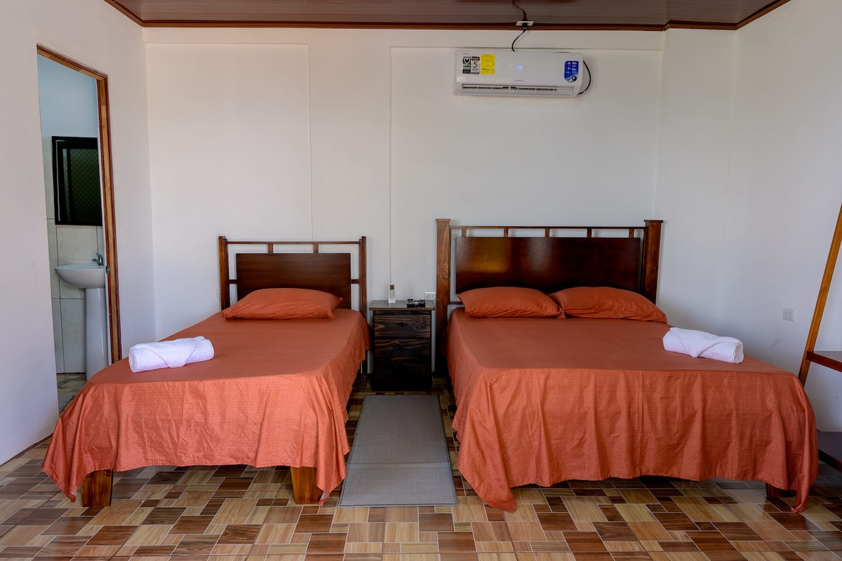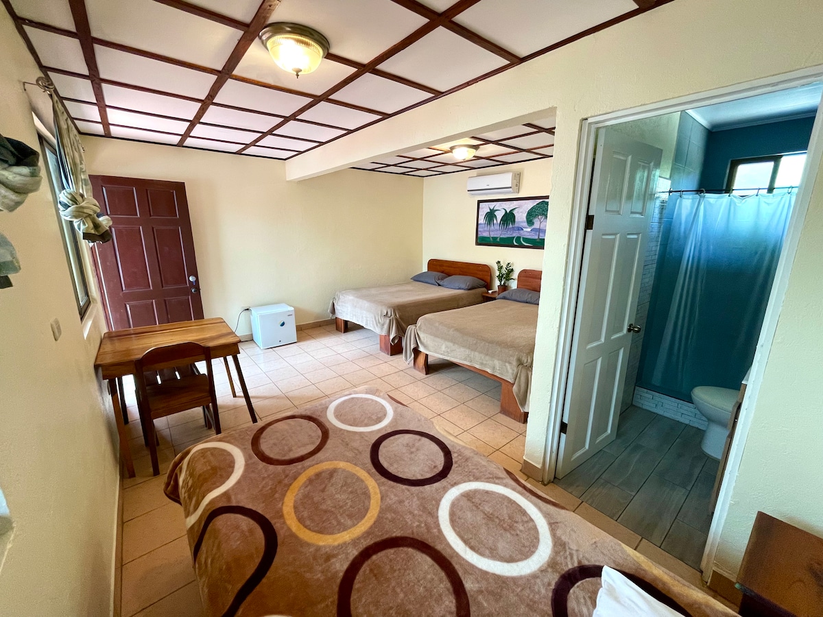 The rooms are comfortable, fitting about 2-3 per room. We have a communal outside kitchen with a patio, barbecue, and a beautiful landscape of colorful & local plants. You can cook a delicious meal or make a cup of coffee and relax with a book by the pool. We also accept furry friends! All rooms have AC, WIFI, Hot Water, Private Bathroom, and a Mini Fridge. Very close to the hotel you will find various restaurants to enjoy a relaxed meal. Nearby there are multiple stores to buy food & drinks.