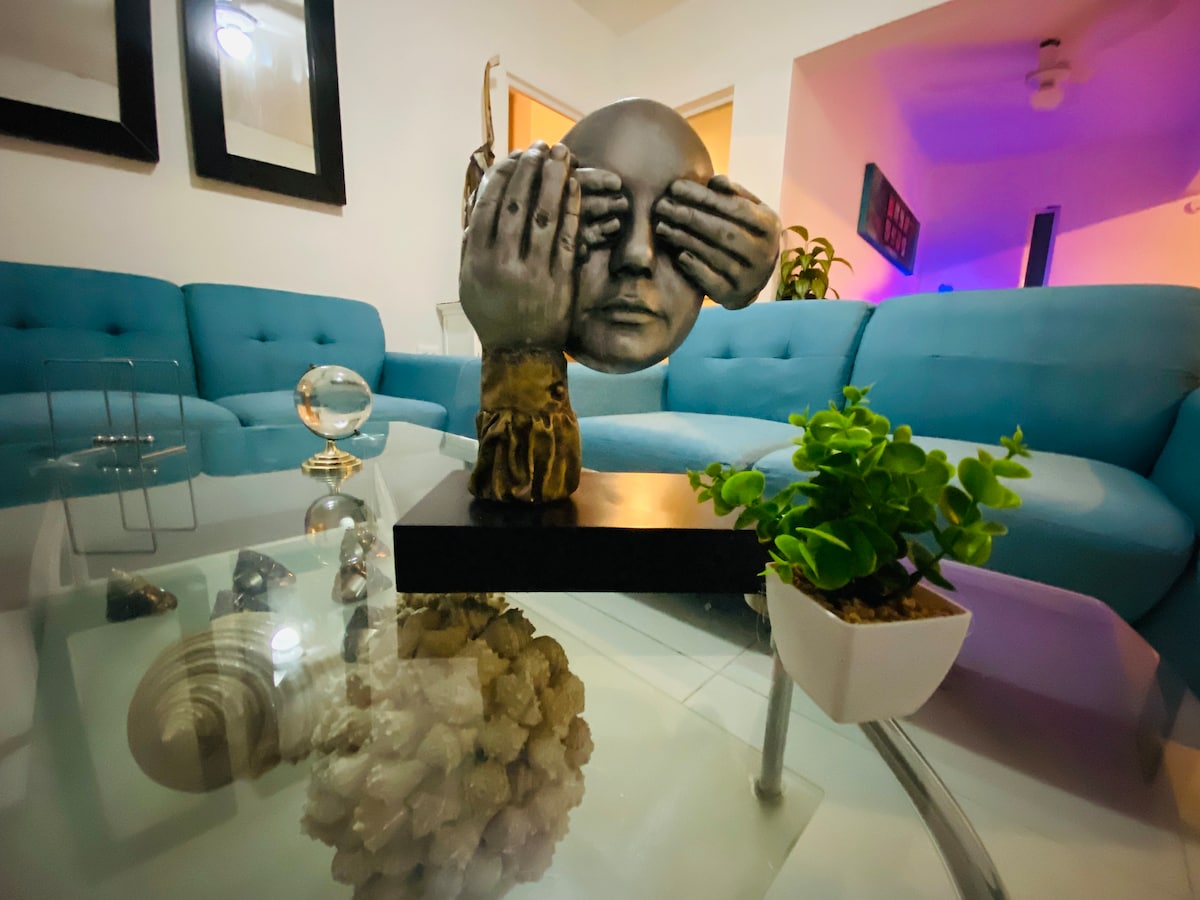 Este alojamiento único cuenta con espacio suficiente para una tranquila estancia en compañía de los tuyos. Pensado para tu comodidad con mucho espacio y complementos para que te sientas como en casa, con internet, tv, sofá cama, una amplia estancia y dos habitaciones. Cercano a lugares de interés como el Consulado Americano, Club de Golf y hospitales. Con supermercado en la parte inferior, cafetería, gasolinera y banco. En una estancia de más de 5 noches se agrega botella de vino de bienvenida !