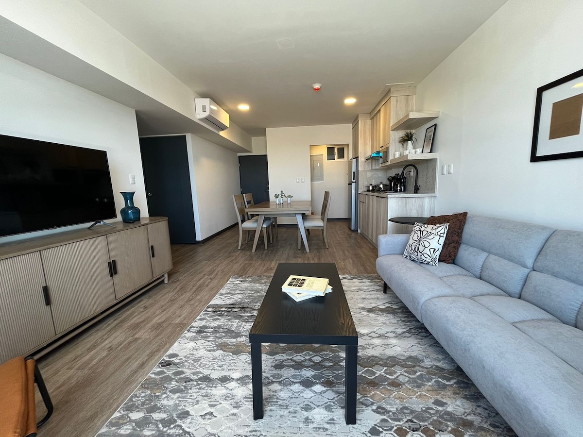 ¡Bienvenido a este maravilloso departamento nuevo! Este acogedor espacio cuenta con una Ubicación privilegiada. - A minutos del centro de la ciudad - Coworking (piso 2) - Gimnasio (piso 2) - Canchas de pádel - Alberca - Terrazas (piso 13) - Asadores - Seguridad las 24 horas del día - Elevadores - Cama matrimonial - Cama para niños individual - Sofá cama - Televisión Espacio ideal para 4 personas 3 adultos y 1 niñ@.