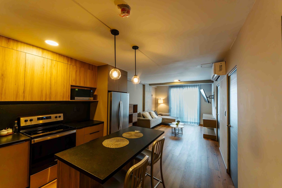 ¡Bienvenido a este maravilloso departamento nuevo! Este acogedor espacio cuenta con una Ubicación privilegiada. - A minutos del centro de la ciudad - Coworking (piso 2) - Gimnasio (piso 2) - Canchas de pádel - Alberca - Terrazas (piso 13) - Asadores - Seguridad las 24 horas del día - Elevadores - Cama matrimonial - Cama para niños individual - Sofá cama - Televisión Espacio ideal para 4 personas 3 adultos y 1 niñ@.
