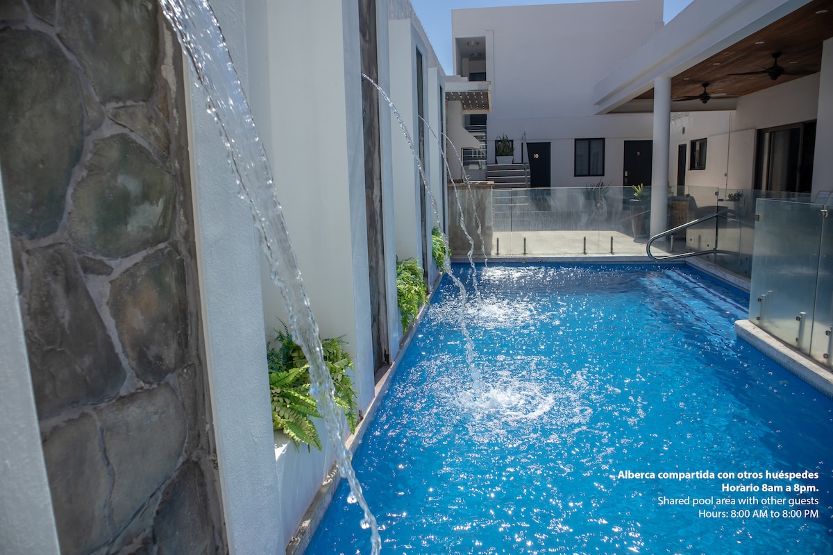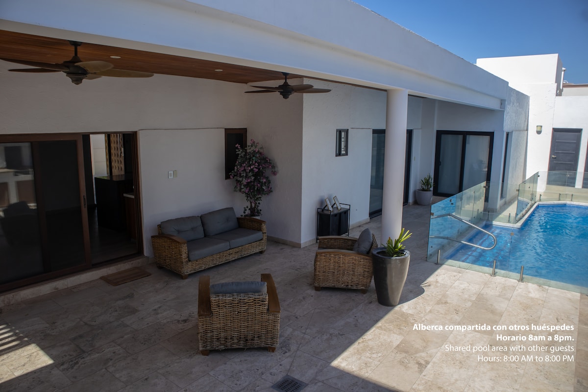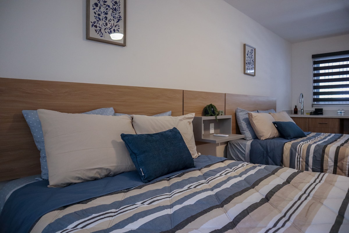 Habitación privada ideal para familias que visitan el Consulado Americano, a solo 2 minutos caminando. Cuenta con baño y cocina propia, escritorio de trabajo y dos camas Queen. Ademas tienen acceso a alberca y áreas abiertas para descansar. Comodidad, privacidad y excelente ubicación para tu cita o viaje de trabajo. **Estacionamiento a disponibilidad** **4 personas, INCLUYENDO NIÑOS Y BEBÉS**