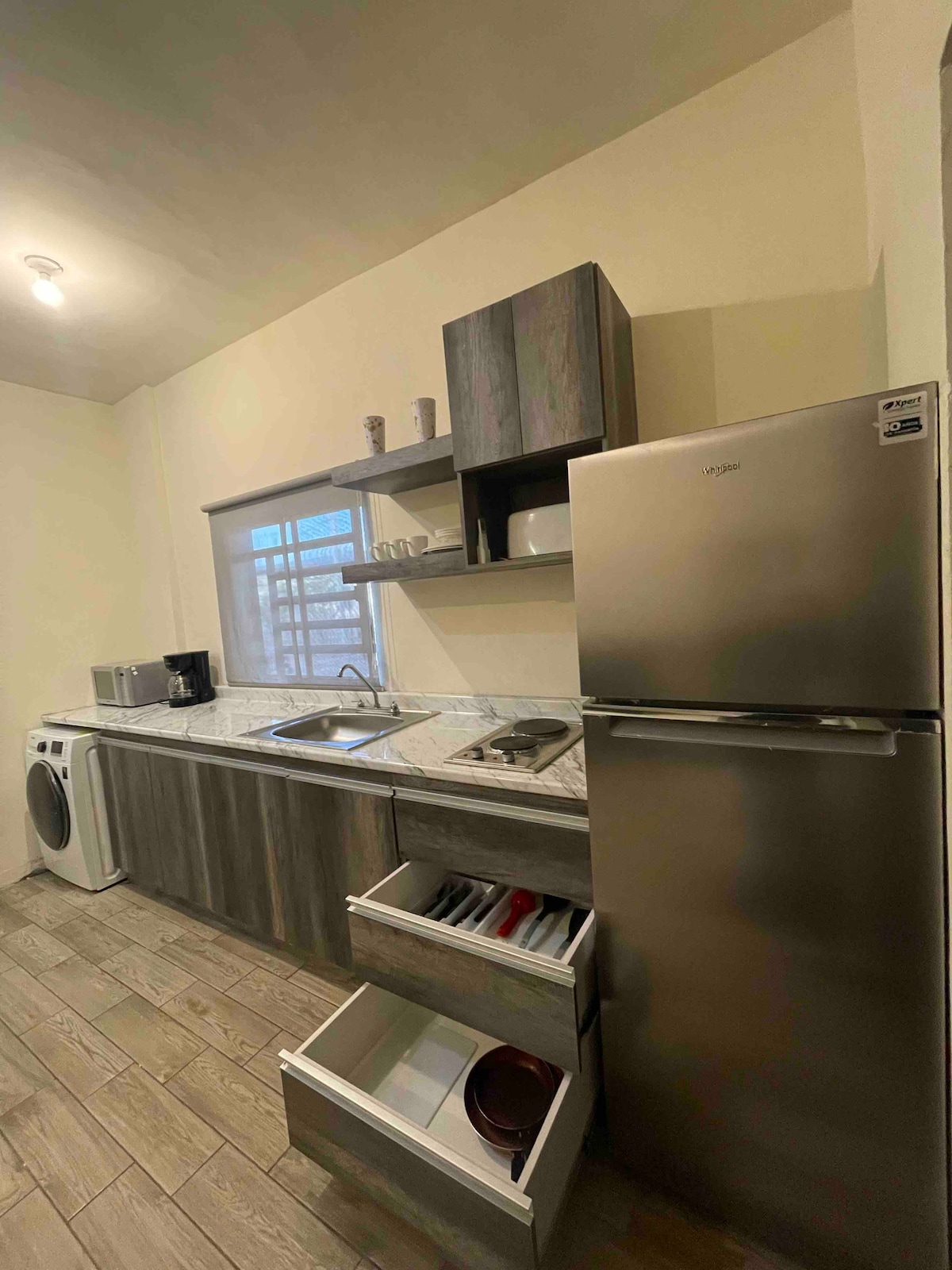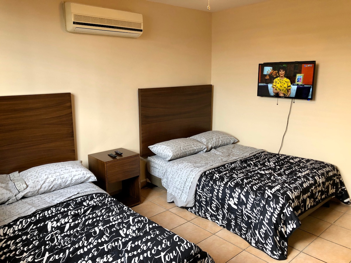 Disfruta de la comodidad de este increíble alojamiento independiente, completamente nuevo, tranquilo y céntrico en la ciudad de Hermosillo. Cerca de consulado, Perfecto para estancias largas y cortas, cuenta con todos los servicios, cama muy comoda tamaño queen, baño amplio con sus amenidades,sala comedor, smart Tv, cocina equipada con todo lo necesario, microondas, placa eléctrica y cafetera. instalaciones con limpieza impecable.