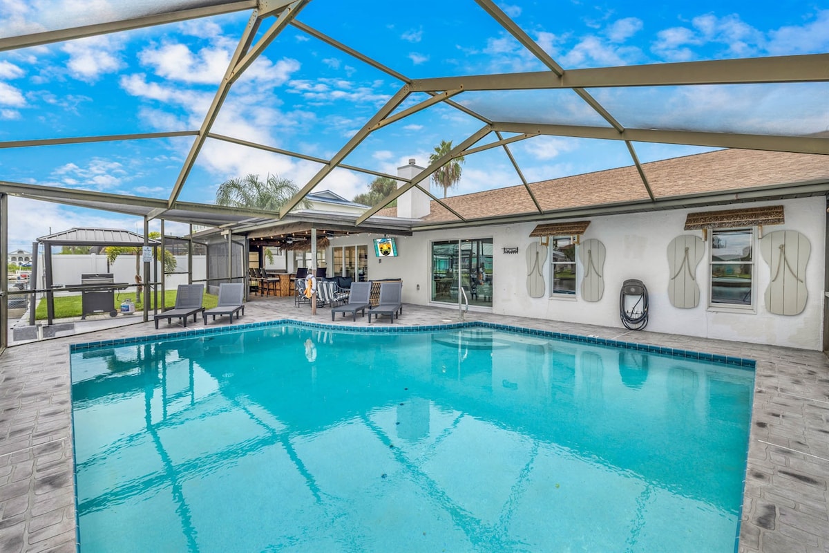 Relax with the whole family at this peaceful home. Beautiful sunsets and water views. Enclosed patio, inground pool, outdoor bar with bathroom, laundry room, private boat dock. Boat rentals available @ Hernando Beach Motel. 5 minutes from Weeki Wachee preserves that include bike, walking trails, bird watching, and lakes. Close to Walmart, restaurants, bars with music. 1 hr to Tampa, 2 hrs to Disney Pine Island Beach 3 miles away.