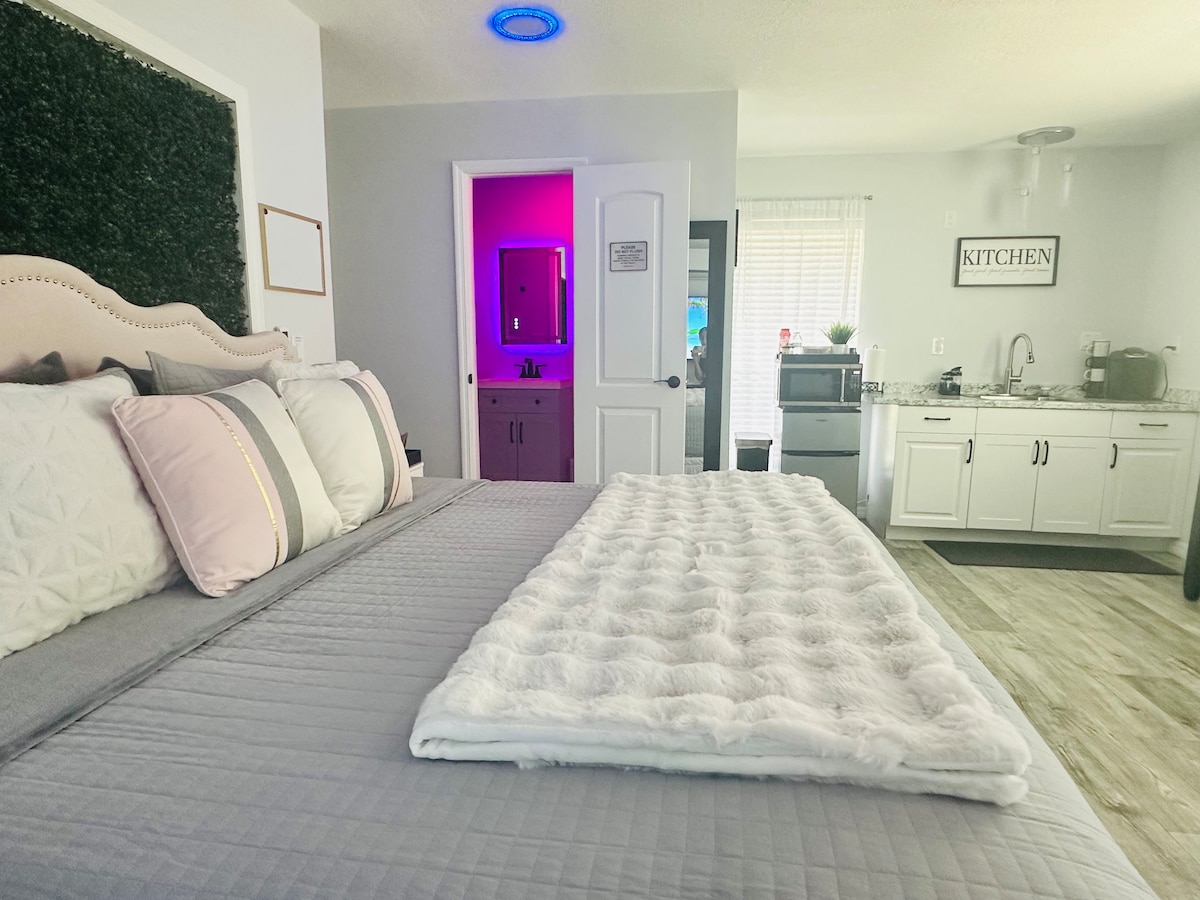 Private Attached Pool Suite – CLEAN & Cozy! Not shared. Heated pool available (fee applies). Enjoy outdoor seating, loungers, grill, fireplace & TV. Inside: plush king bed, reclining sofa, and kitchenette with fridge, sink, microwave, toaster oven & more. One small pet (under 25 lbs) welcome with fee. Just 5 miles from Weeki Wachee Springs. Peaceful, private, and perfect for couples or solo travelers looking to relax!