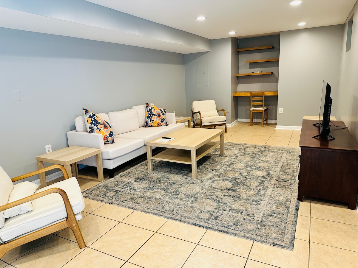 Welcome to our stylish basement apartment, perfect for modern travelers. Whether you're here for work or leisure, this space has you covered. Situated minutes from the Metro, Airport, and major work centers. The apartment features a desk with dual monitors, keyboard, mouse, and 1GB internet. At night, relax in the plush king-size bed. A convertible futon couch with a 65-inch TV, awaits your binge-watching sessions. A washer/dryer and full kitchen, w/refrigerator and stove complete the space.