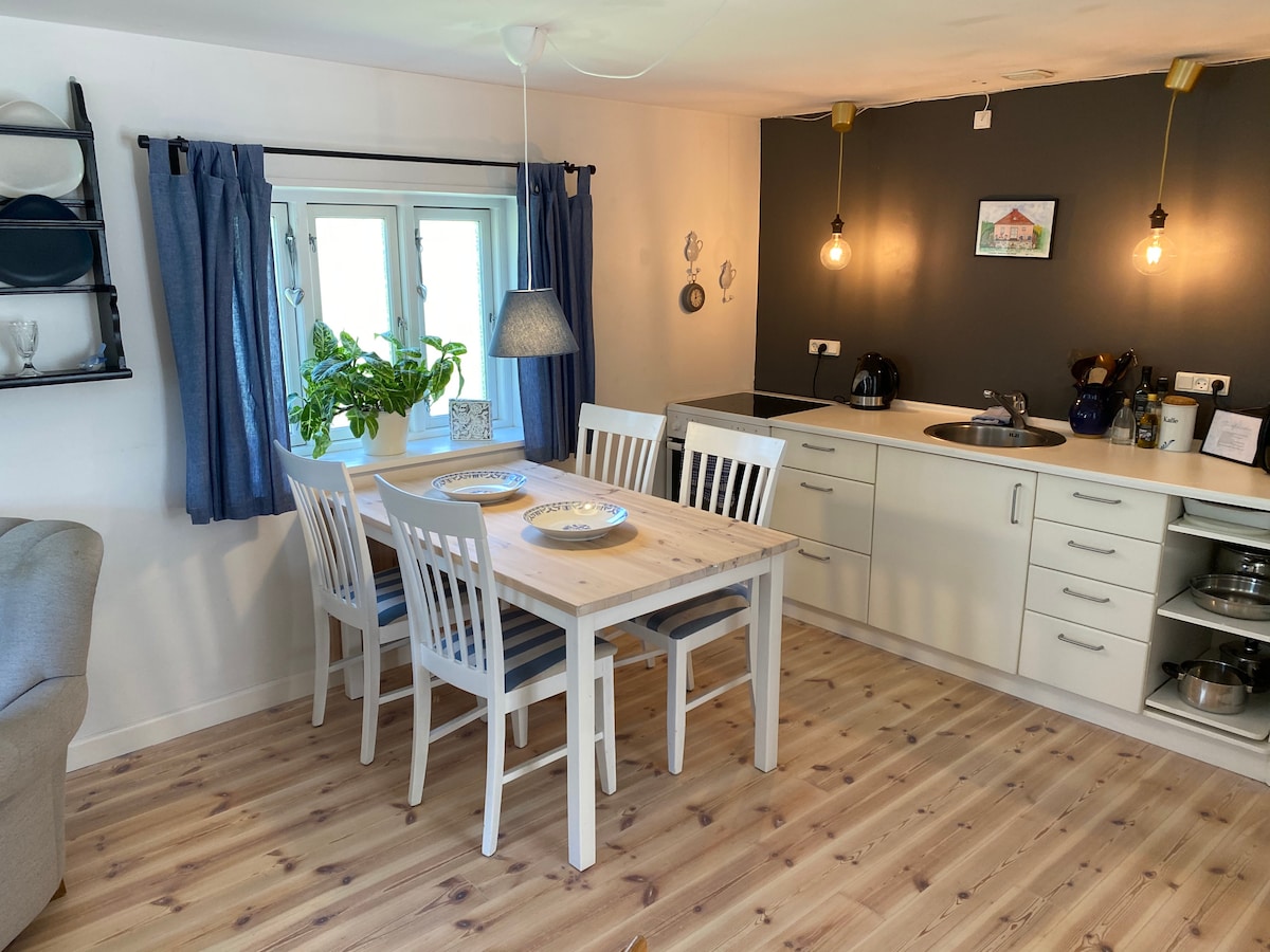 Cosy guest house, which is an independent building on the old school . The flat is 51m2 and has a lovely south-facing private 28m2 terrace. Combined kitchen and living room, a toilet/bath, an entry hall and a bedroom with one queen size bed and two bunk beds. The terrace is furnished with garden furniture, and there is wifi, tv, cromecast and parking near the entry door. Two extra beds can be made in the living room. Bonfire hut, tarzan track, hammocks and a large garden with playground.