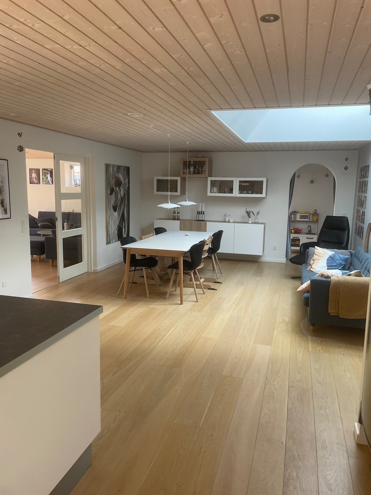 Ny Lejlighed 200 m2 : Stue indrettet med spise-og sofa arrangement med tv. Der er udgang til altan. Der er tekøkken med airfryer, køleskab, microovn, kaffemaskine,elkedel, service mm Der er adgang til fryseboks. Stort badeværelse med puslebord. Et soveværelse med dobbeltseng, et værelse med 3/4 seng og skrivebord. et værelse med 2 box madrasser og en sovesofa samt kontorplads samt et stort spille, legerum, evt extra sovepladser.Der er adgang til & tøjvask. Der er udsigt til skov, mark og have.