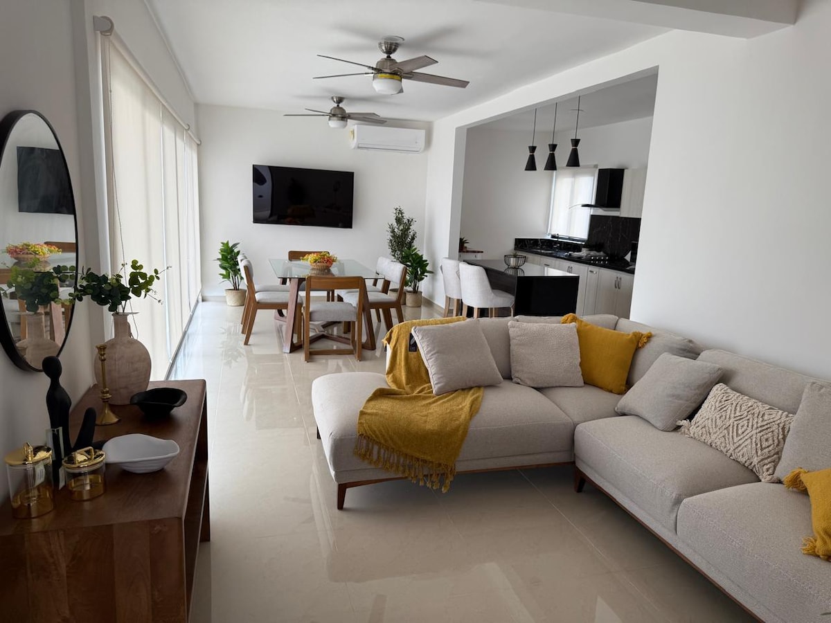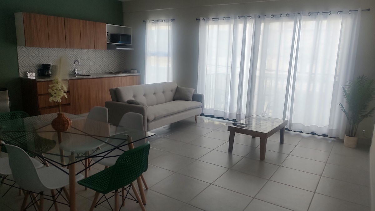 Departamento a 3 minutos de la playa en carro o 15 minutos caminando, cerca de Plaza Mocambo, Soriana , Walmart. Totalmente amueblado con diseño "fresco". Cupo 2 personas máximo 3(sofá individual)cuenta con baño, cocina y comedor. No es un lugar para fiesta, está planeado para descansar y respetar a los otros inquilinos. Por eso se pide 10.30pm bajar música u otro tipo de ruidos. Check in 3 pm Check out 10 am Mascotas están prohibidas Niños mayores de 8 años