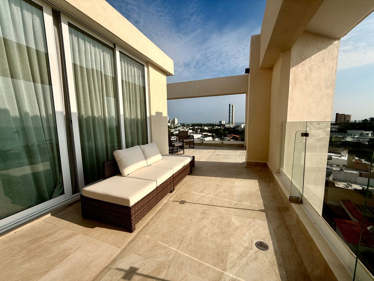 Departamento nuevo, entrada independiente en cuarto piso, comodidades necesarias para tener una estancia relajante y satisfactoria, que incluye cocineta, utensilios básicos de cocina, baño completo, Internet de 50 megas de velocidad, y TV de cable. Ubicado cerca de Paseo Martí, a 100 metros de la playa y facilidad de transporte público al centro de Veracruz o Boca del Río. Ideal para vacaciones o para viaje de negocios, disfrute de la privacidad y tranquilidad.