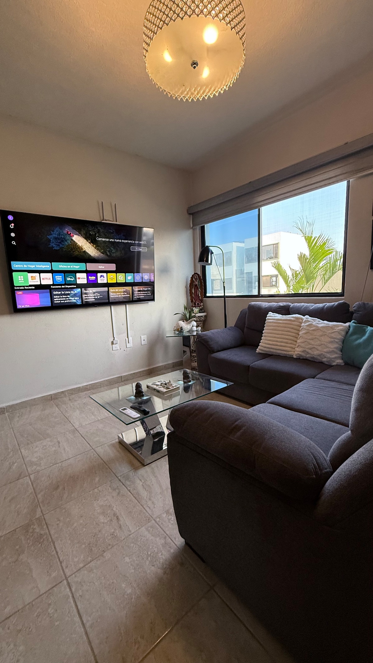 Pequeño departamento con sala y televisión, barra para tomar alimentos, cocineta con parrilla de inducción y servibar, baño completo y litera con cama matrimonial abajo e individual arriba además de otra cama individual. Entrada autónoma mediante video de instrucción.