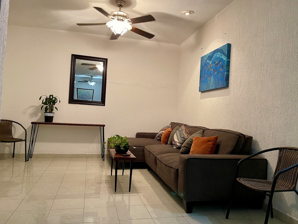 Nuestra casita es un espacio cálido y hogareño. La recámara principal cuenta con cama matrimonial, aire acondicionado, closet amplio, plancha y burro de planchar. La segunda recámara cuenta con cama individual y ventilador. Baño entero, WiFi, sala-comedor con TV y Chromecast, cocina integral equipada con frigobar, microondas, cafetera, tostador de pan, parrilla de gas, lavadora. Una pequeña área de lectura y un pequeño patio trasero. Toda la casa con protecciones. A solo 20 minutos de la playa