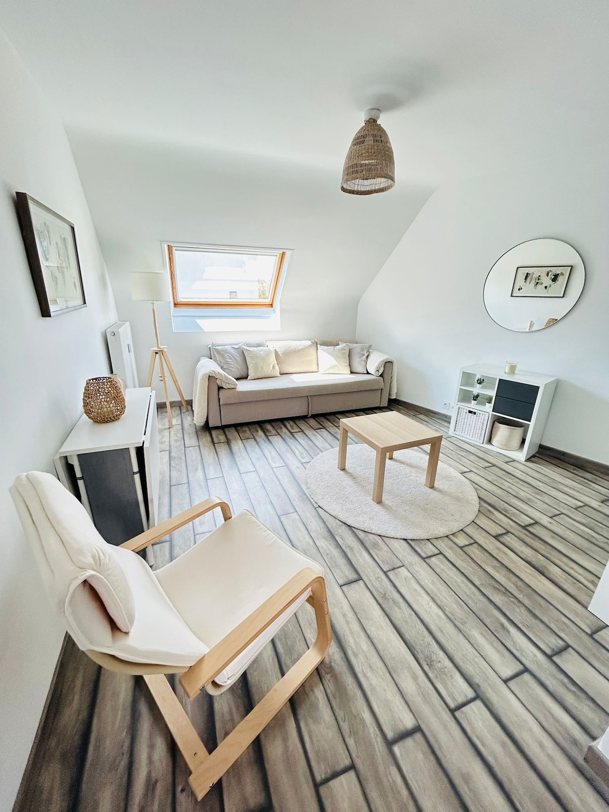 Détendez-vous dans ce logement calme et élégant. L’appartement entièrement refait à neuf fin 2022 est doté d’une entrée indépendante. Ce logement en duplex offre : - au rez-de-chaussée, entrée avec escalier donnant accès à l’étage, chambre avec 2 lits d’1 personne (10m2) - à l’étage, séjour ouvert sur la cuisine, chambre avec 1 lit 2 personnes (12m2), salle de bains et toilettes séparés. L’appartement est lumineux et traversant, situé dans le vieux Colombelles, au bord de l’orne.