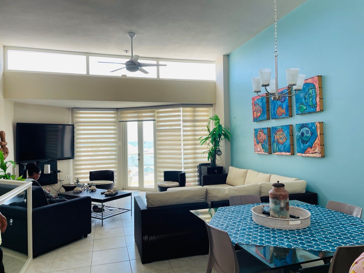 This is a bright two-bedroom, three-bathroom, ocean view apartment. It has great, comfortable furnishings, a fully stocked kitchen, an ocean view balcony, in-unit washer and dryer, and an elevator. There is a common pool which is beachfront. This complex is located on a great quiet where it's not unusual to see wild horses, and in a quiet area of Rio Grande, not far from the El Yunque Rainforest and the SJU airport.