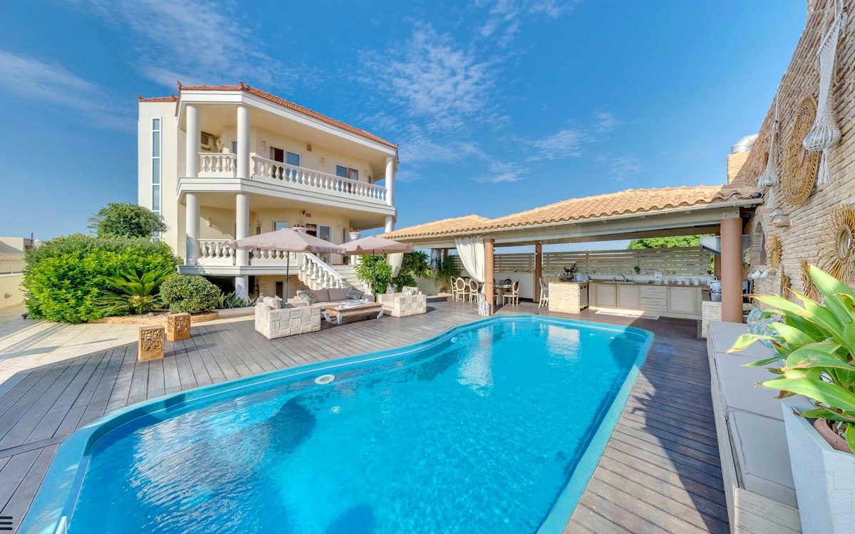 Villa Mourveri is located out of the city of Heraklion. You can enjoy not only the fantastic view of the city , but also the mountains of Crete and a panoramic sea view. This makes it an ideal place for relaxation and rest. We provide you 6 air-conditioned bedrooms, 3 living rooms, kitchen, complete household equipment, 3 bathrooms, and a private swimming pool. You can either relax on the balconies and the terrace or have fun at the BBQ.
