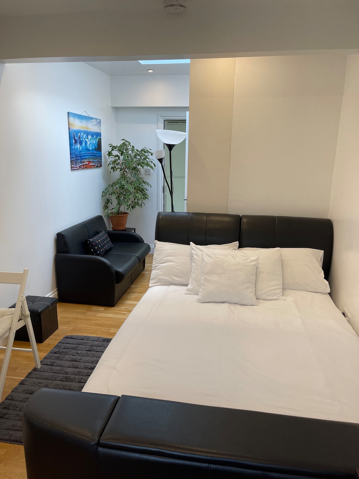 This top floor studio is a gem, close to central London. It is a tranquil, spacious hideaway in Finchley.The tube station is 7 mins walk away and takes 25 mins to all London highlights.Separate bathroom+kitchenette The kingsize bed has elegant hotel bedlinen with luxurious duvets & Alpaca throws with a choice of plump feather or anti-allergy pillows.There is off street parking available and easy links to major airports. Quiet location but close to cafes and shops.