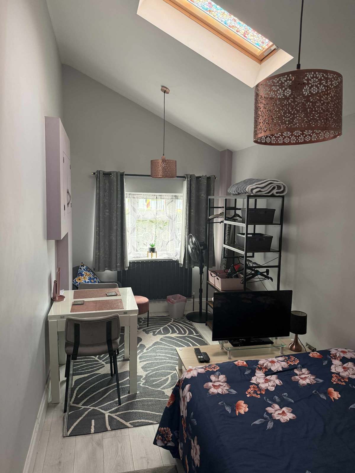 A magical retreat for Harry Potter fans. Newly styled to an exceptional standard, the room features a modern en-suite with shower, small double bed, TV, ironing facilities, fridge, dining essentials, fan, plus plush blankets and extra pillows. A light breakfast of fruit, pastries and cereals is included. Enjoy daily cleaning and freshly replenished amenities. The room has its own private entrance and is fully separated from the main house, ensuring complete privacy and an enchanting stay. 2/2