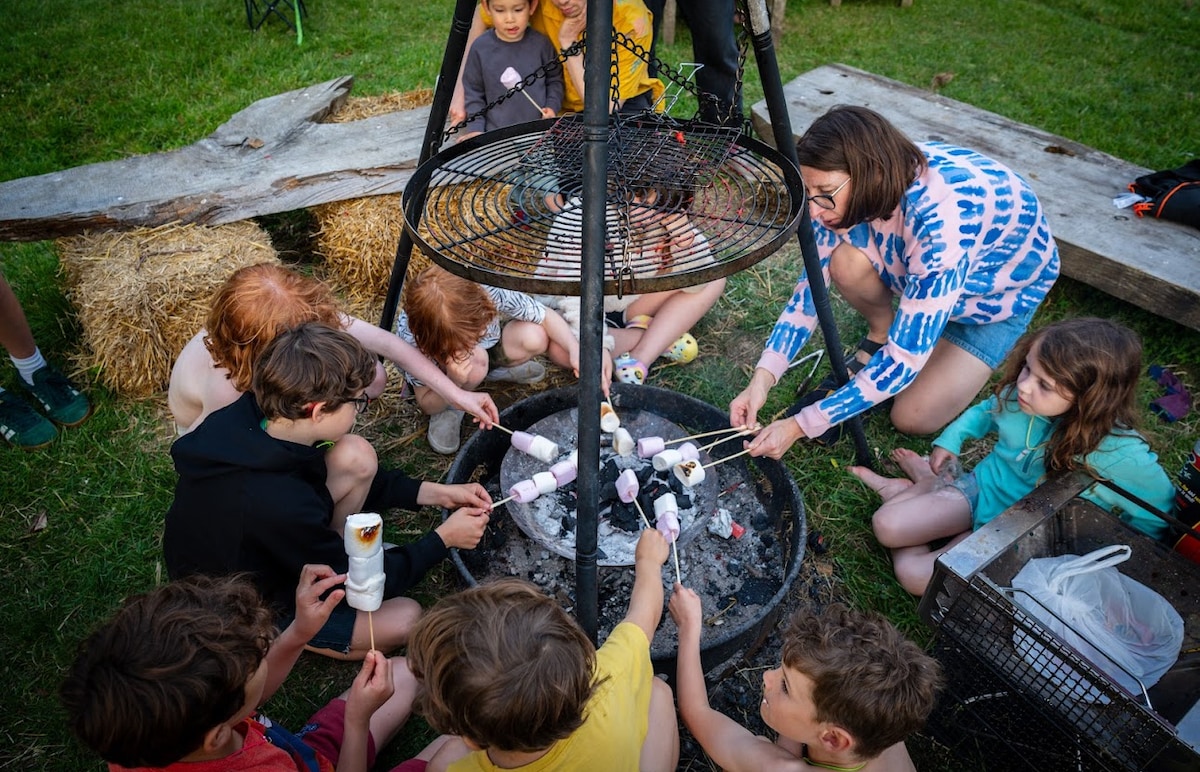 Enjoy the natural beauty of goldings 60 acre grade 1 listed country estate farm. Just bring bedding, pjs,. We provide the rest, including large belltent with double bed & additional beds. lights , firepit bbq , Ibcludes all activities , zipwire, farm tours and pygmy goat walking ,goldings beach , boats, paddle boards . fishing craft and loads more. There is a fully equipped outdoor kitchen for you to use . This includes everything needed for your stay. events , party’s only with prior approval