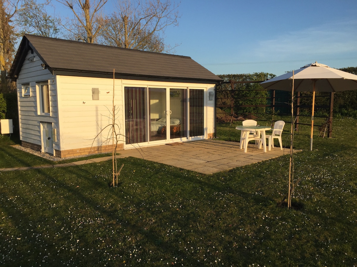 Detached chalet luxuriously appointed with smart TV with Netflix .silent ,good sized fridge, kettle ,toaster microwave,iron and board) comfortable king size bed with large bedside tables with plenty of clothes storage, and hanging space.there is a small table with chairs stored under the bed,so can be used for meals or a work space.we have a newly refurbished bathroom,with massive walk in shower..there is outdoor table and chairs to enjoy the afternoon sunshine.