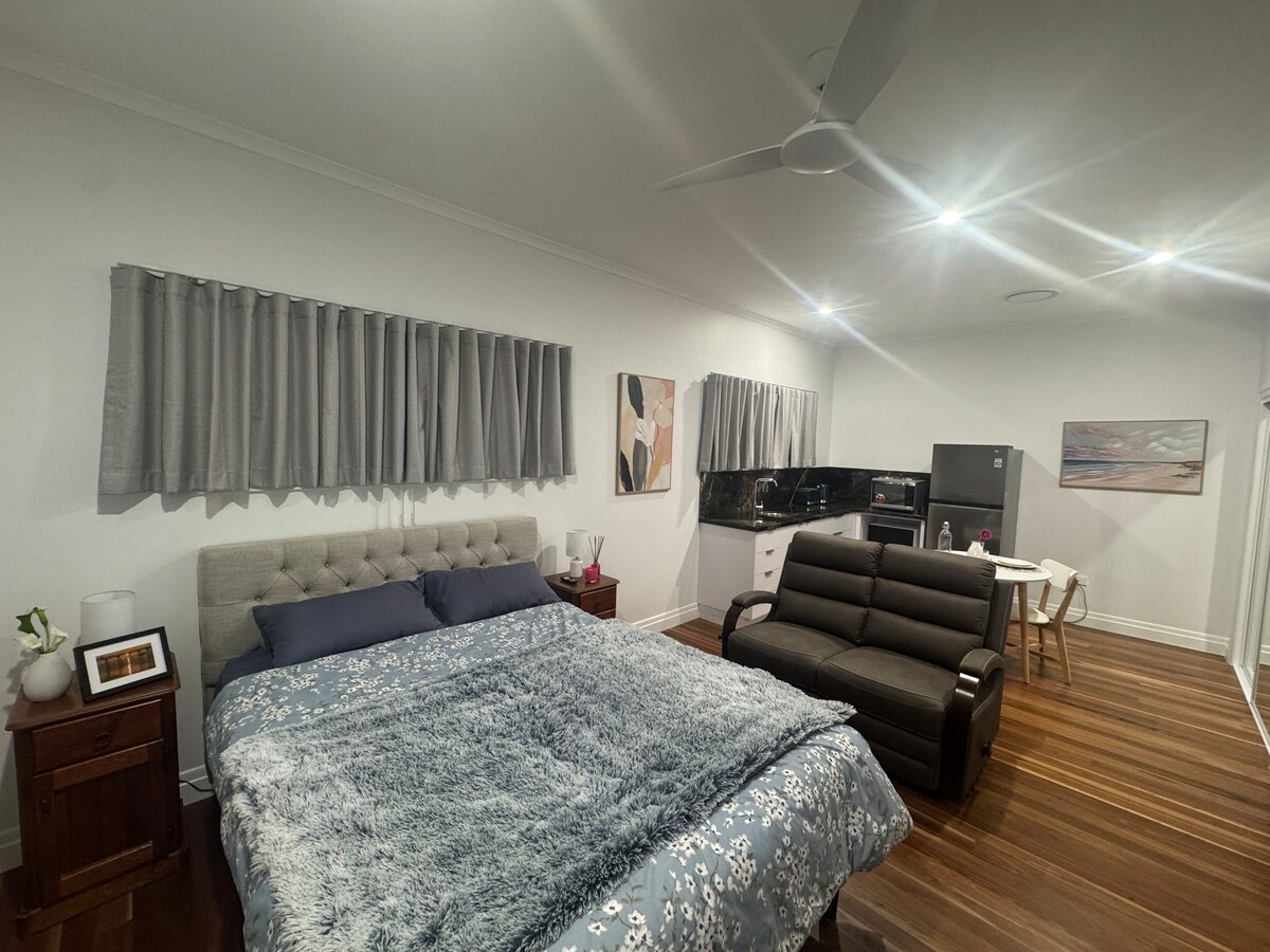 Welcome to our lovely, fully self-contained studio apartment — your own tropical sanctuary. Fresh and clean, the studio has everything you need for a comfortable and relaxing stay. The studio is located in the backyard of our home, converted to host guests. You’ll enjoy a private entrance and your own peaceful space, separate from the main house. Step outside to a tranquil deck, perfect for enjoying a cuppa or an evening glass of wine. 🚭 Please note: This is a non-smoking property.