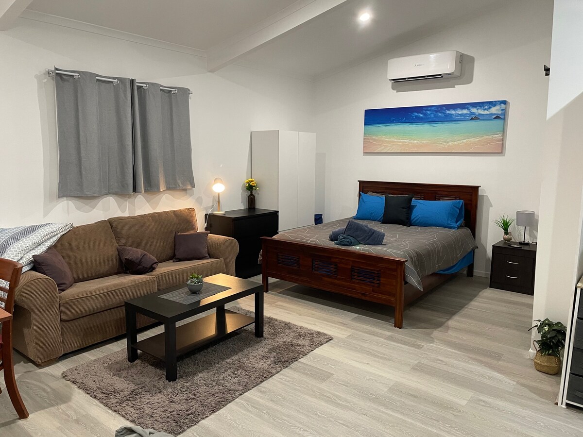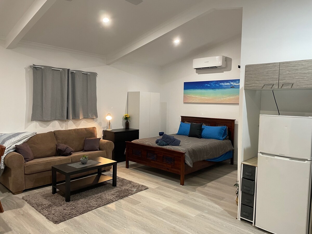 Welcome to our lovely, fully self-contained studio apartment — your own tropical sanctuary. Fresh and clean, the studio has everything you need for a comfortable and relaxing stay. The studio is located in the backyard of our home, converted to host guests. You’ll enjoy a private entrance and your own peaceful space, separate from the main house. Step outside to a tranquil deck, perfect for enjoying a cuppa or an evening glass of wine. 🚭 Please note: This is a non-smoking property.