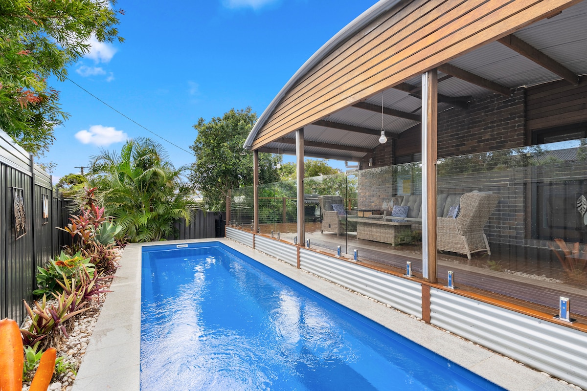 Our Central Poolside Haven is nestled amidst expansive decking & gardens.This 3-bedroom home offers a blend of comfort & convenience.Our kitchen is large and decked out with modern appliances, indoor/outdoor dining. The lounge is spacious with a smart TV, unlimited wifi. We offer 2 Queen sized and Twin Single bedrooms & private study. Our Salt Lap Pool below deck offers an oasis of relaxation. Our fully fenced yard ensures both safety & fun for kids & furry friends. Security gated & private.