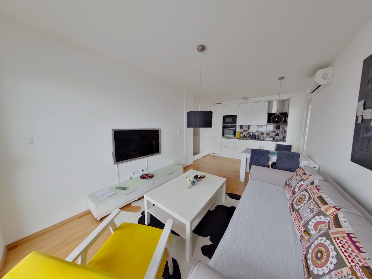The apartment has its own garage, which is accessed by an elevator directly in front of the apartment. Balcony + terrace. Two bedrooms. One with a double bed, the other with two separate beds. Possibility of extra bed. Bathroom with bathtub + smaller toilet. Dishwasher, washing machine, air-cond, TV, WIFI, mobile WIFI router, mobile phone with local SIM card... The possibility of using exercise equipment in the apartment (free of charge). Within 50 meters are a supermarket and a gastropub.