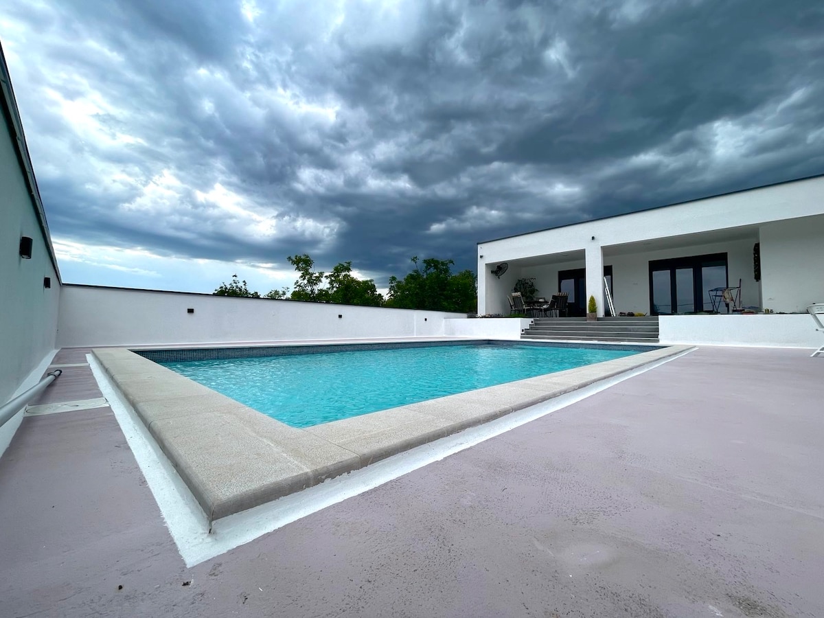 Forget your worries in this spacious and serene space surrounded with nature and peace. House Villa la Vita is divided in 2 separate apartments, each has swimming pool and private yard with grill and outside furniture. Each apt has 3 rooms with queen size bed and private toilet, and big kitchen and living room with double sofa and terrace exit. Big terrace includes swimming pool and furniture, grill and dining table, and private parking with gorgeous landscape view.