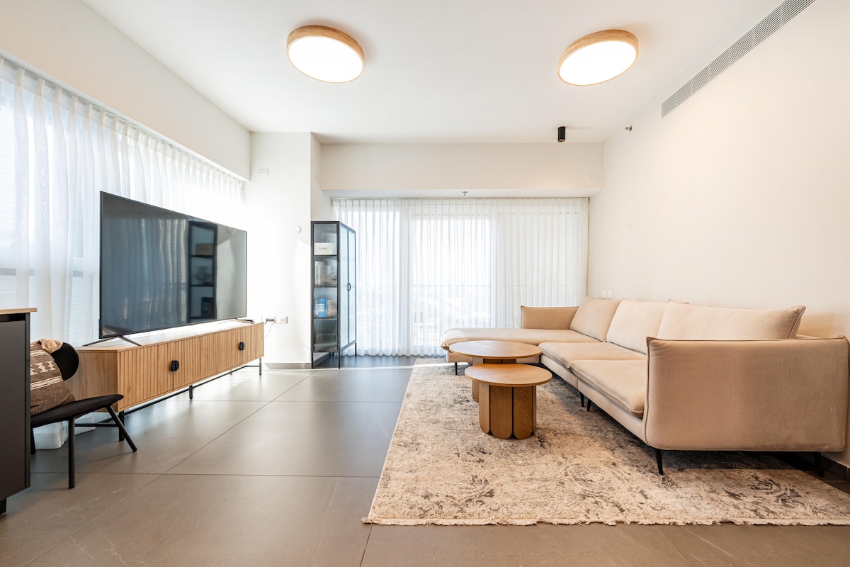 Luxury apartment with panoramic views of the sea, Jaffa, and Tel Aviv. Bright living room with floor-to-ceiling windows, modern kitchen, and spacious balcony. Two sea-view bedrooms and two elegant bathrooms. Guests enjoy indoor pool, gym, secure parking, and 24/7 concierge. Fast Wi-Fi and modern design, perfect for leisure and business.