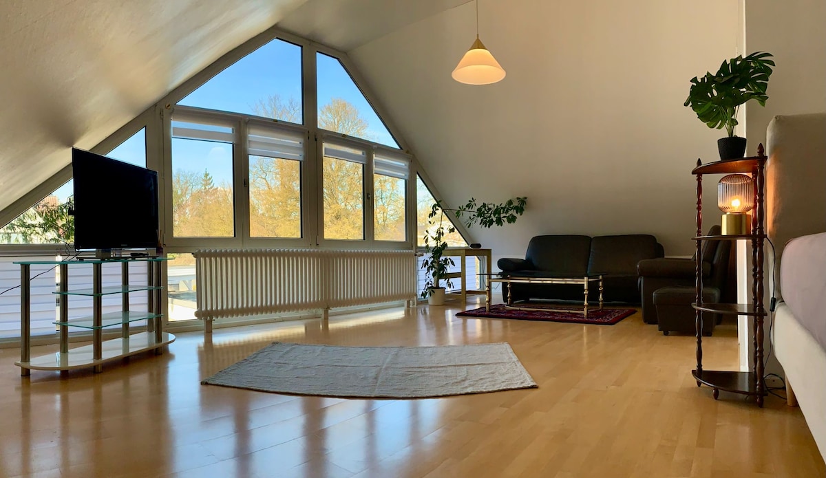 Exceptional duplex apartment with a kind of penthouse with sunny roof terrace in SW location. The particularly charming style of the apartment enchants and makes you feel immediately comfortable. A new high-quality infrared sauna, an ergometer, various fitness and yoga accessories let you completely arrive in relaxation and wellness mode. The center is only 10 minutes away by bus + train, a top shopping center can be reached in 5 minutes on foot. A wonderful time awaits you!