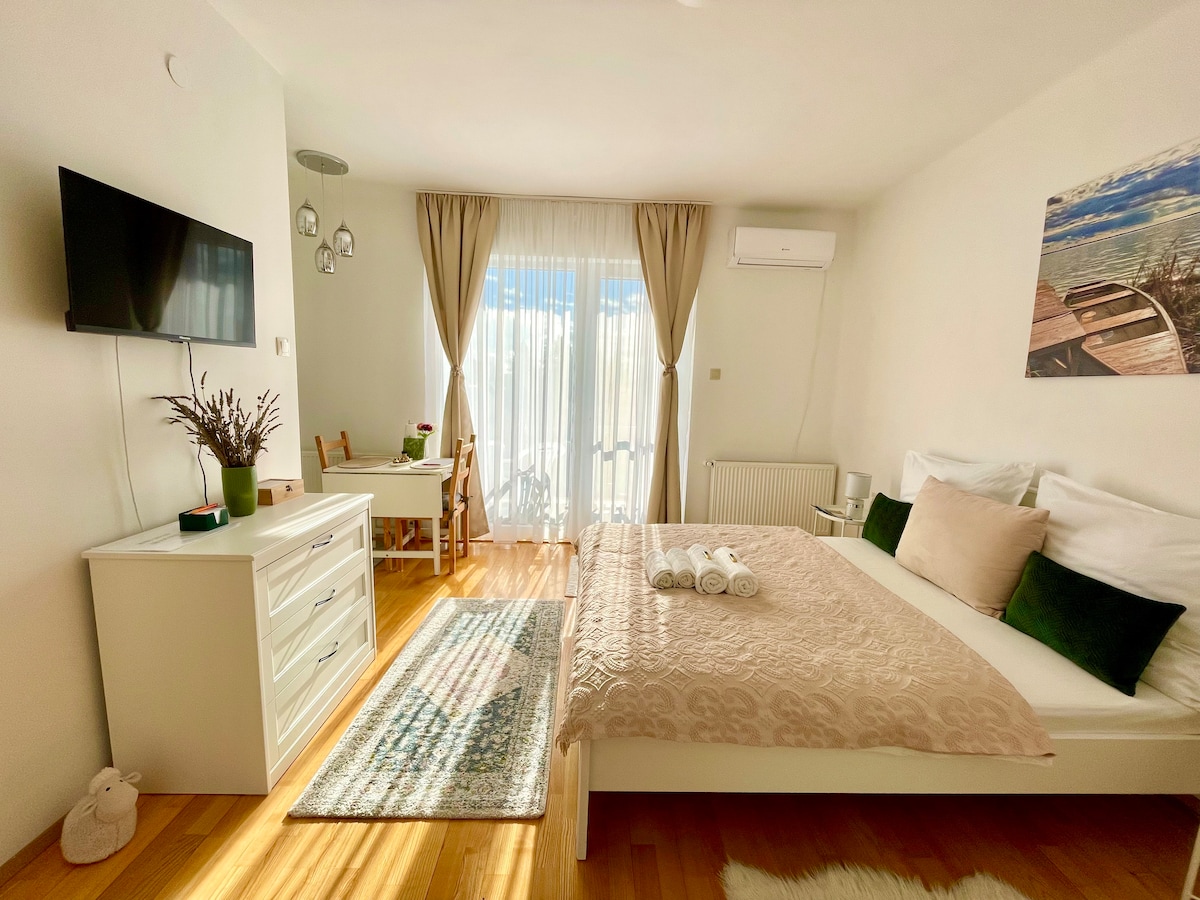 Beaches, city center and transport stations can be reached within a short walk. Each apartment has its own garden and outdoor recreation opportunities, barbecue and closed parking. Open all year, with floor heating and air conditioning in each room. We welcome our guests with a family- and child-friendly concept and private wellness elements. - bus stop, train 3 minute - shop, street playground 2 minute - Lake Balaton promenade, restaurants, sandy beach, playground and Ferris wheel very near