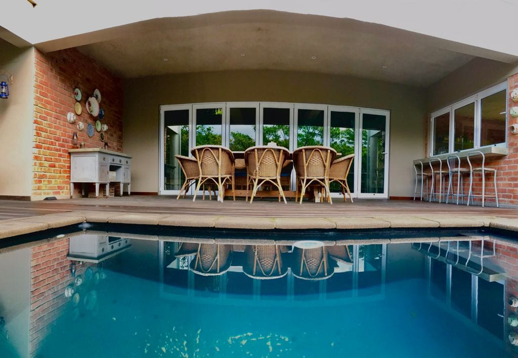 Luxurious fully equiped selfcatering holiday accommodation situated 250m from swimming beach. A modern house with superb elevated sea views from where whales and dolphins are frequently spotted. The verandah boasts "in-door" braai and bar facilities linked directly to a heated-pool : everything you need for care-free holiday living. Five bedrooms accommodate 10people in luxury with garage parking for three vehicles.
