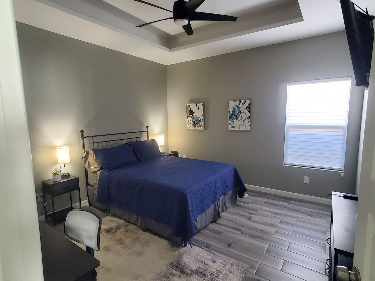 Enjoy a modern apartment, just blocks from Sam's, Costco, and Target. King and queen beds with hybrid memory foam mattresses. Private access. Wi-Fi, smart TV. Two covered parking spaces.