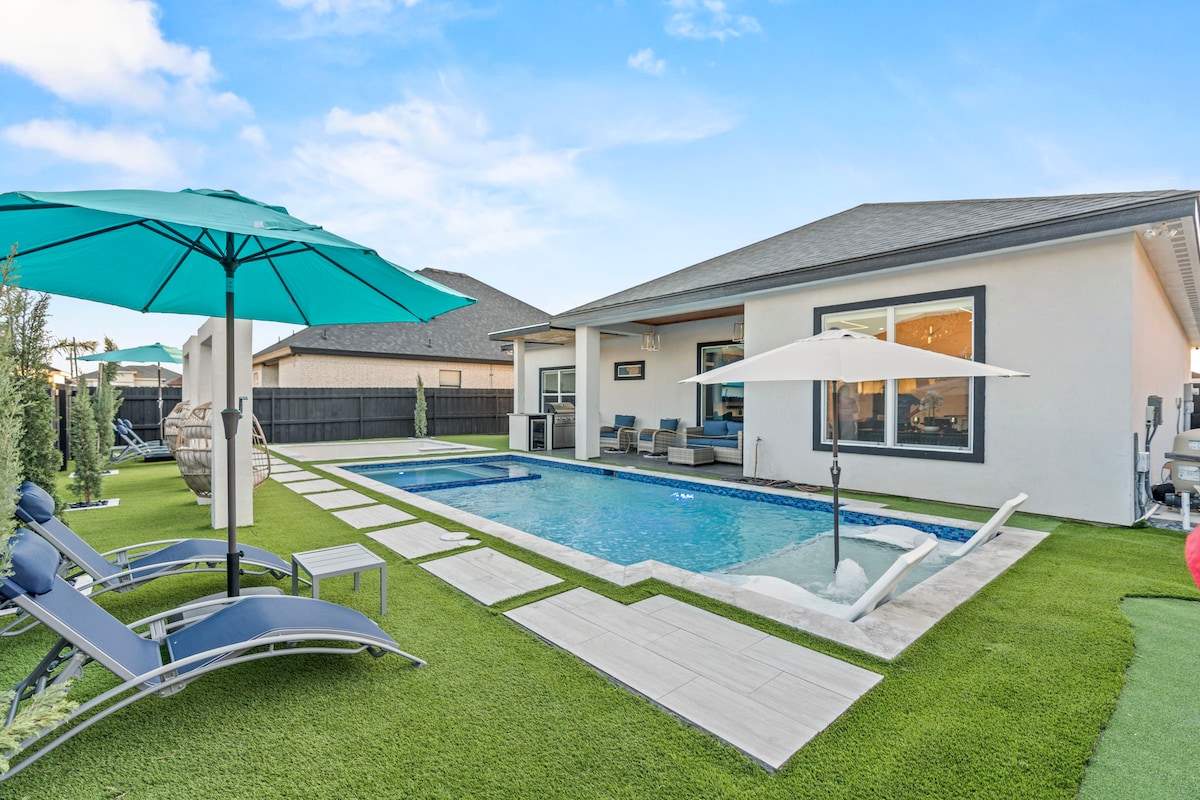豪华三卧室房源,带恒温泳池、水疗设施、迷你高尔夫球场、篝火炉和 100 英寸电视