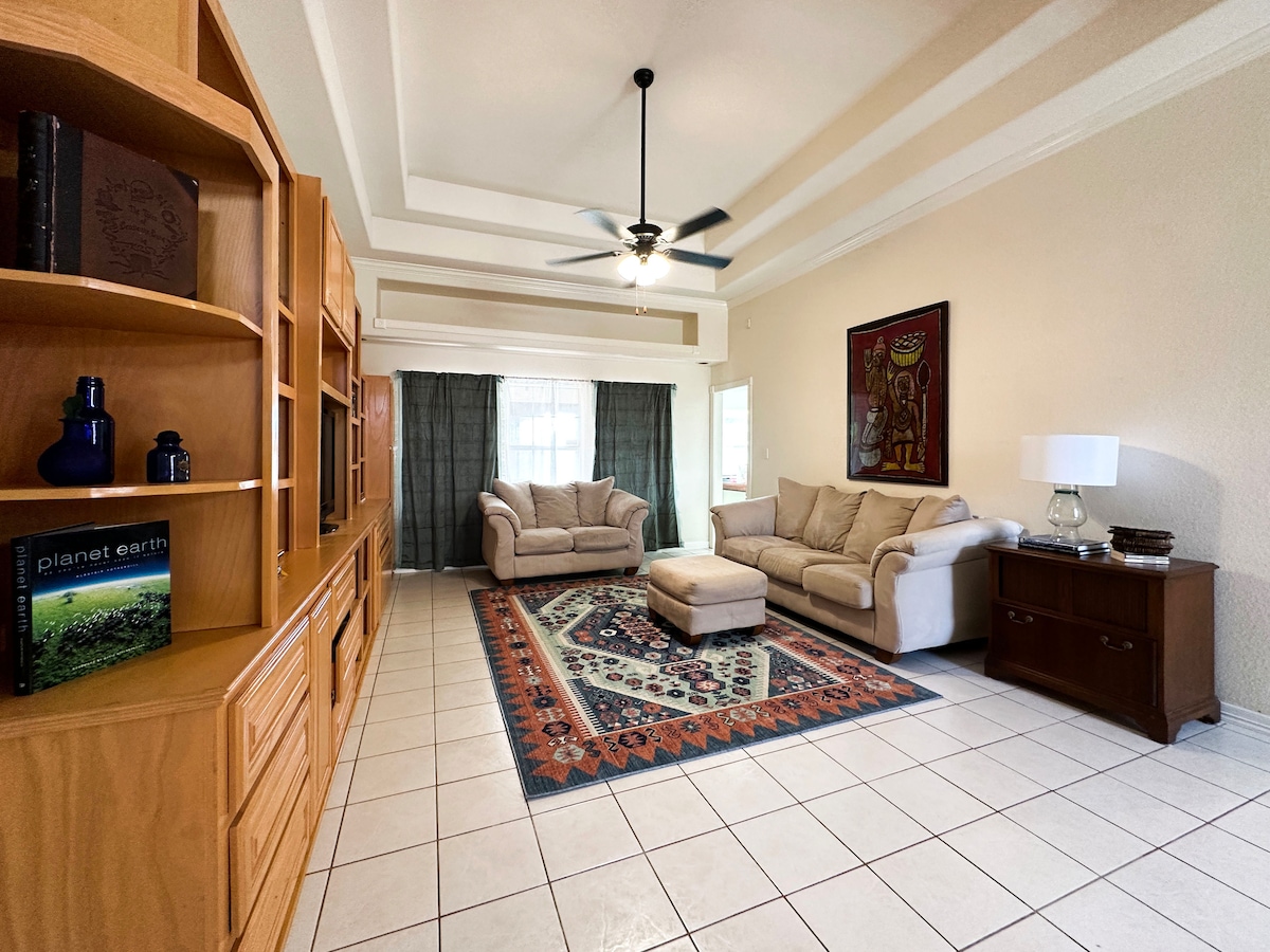 Welcome to The Pink Casa that is thoughtfully designed with comfort, color and culture. This home is conveniently located in the heart of the valley. The Pink Casa borders McAllen, Edinburg and Pharr. You are only: - 2 mins to Expy281 & Expy 83 - 3 mins to Hospitals (DHR & ERMC) - 3 mins to 2nd Street Trail - 5 mins to Bert Ogden Arena - 12 mins to McAllen International Airport But when you stay at The Pink casa you will feel that you are deffinetly on vacation at an island off the shore.