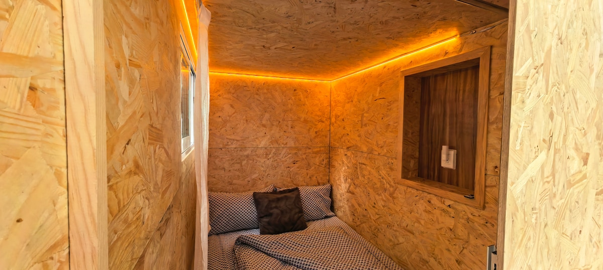 Te encantará esta escapada única y romántica. Descubre una experiencia única dentro de Casa Alí: una cápsula estilo japonés, diseñada para quienes buscan descanso profundo, simplicidad y conexión interior. Este pequeño refugio minimalista te envuelve con su calidez en madera y su atmósfera acogedora. Ideal para viajeros que valoran la tranquilidad, el silencio y los espacios con intención. Cama matrimonial, cómoda y acogedora Iluminación cálida que invita al descanso.