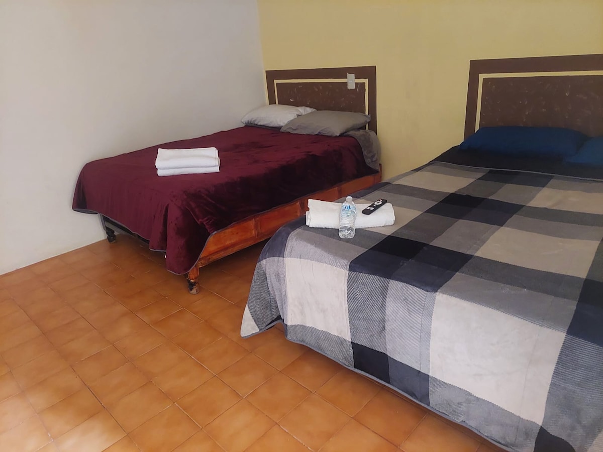 Crea recuerdo únicos y familiares en este lugar donde la tranquilidad se respira. Rancho completo para familias o grupo de amigos grandes. Consta de : Cabaña completa : 3 camas matrimoniales más baño priva y pantalla HD. 3 Recamaras anexas : Cada una con entrada independiente con baño privado cada una.