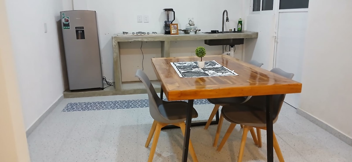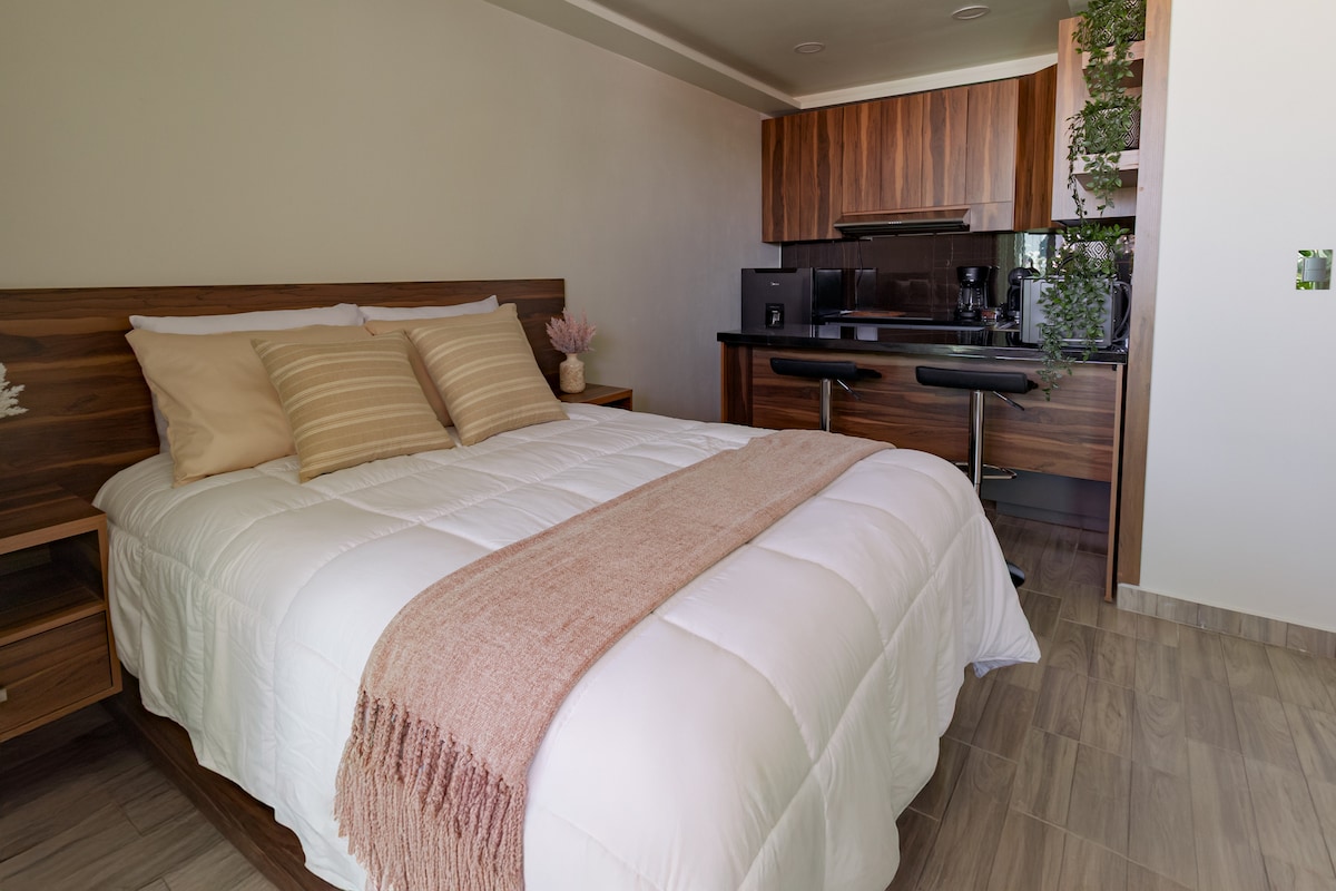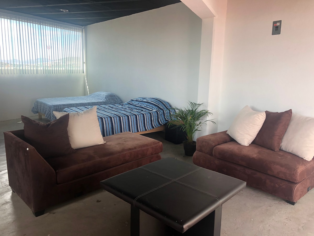 Ideal para tu estancia de un mes en adelante. Ya que no haces ningún gasto extra. Te instalas y a disfrutar del confort del lugar. El mini loft cuenta con todos los servicios incluidos como agua, luz, wi fi, sistema de cable, limpieza,blancos para baño y cama, aseo y sanitización. Cuenta con escritorio - tocador, Closets, cocineta, barra comedor, baño, refrigerador, cafetera, plancha, secadora, pantalla.