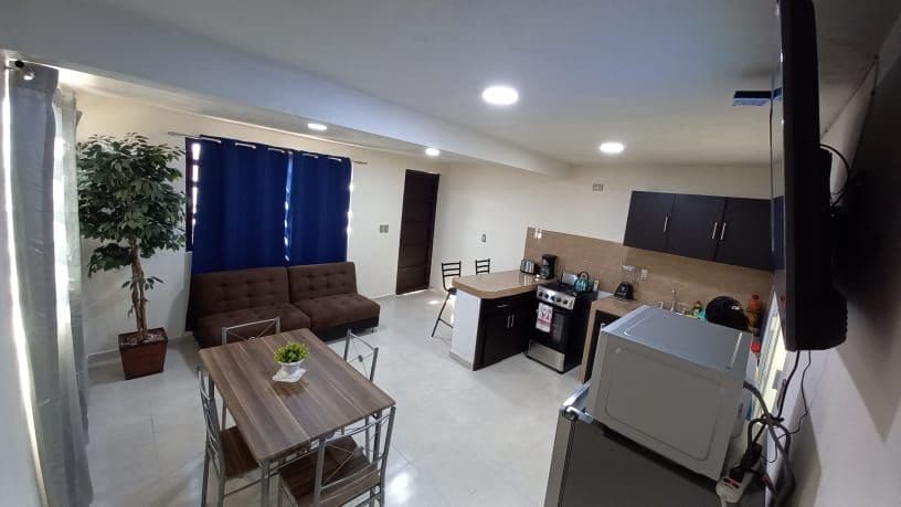 Departamento "Don Cuco" Bello, cómodo y céntrico lugar vacacional; disfruta de nuestra hospitalidad y los servicios que ponemos a tus órdenes en nuestras instalaciones. A cinco minutos del centro histórico. 2 camas matrimoniales, 1 sofá cama y colchón de aire por si lo necesitas.