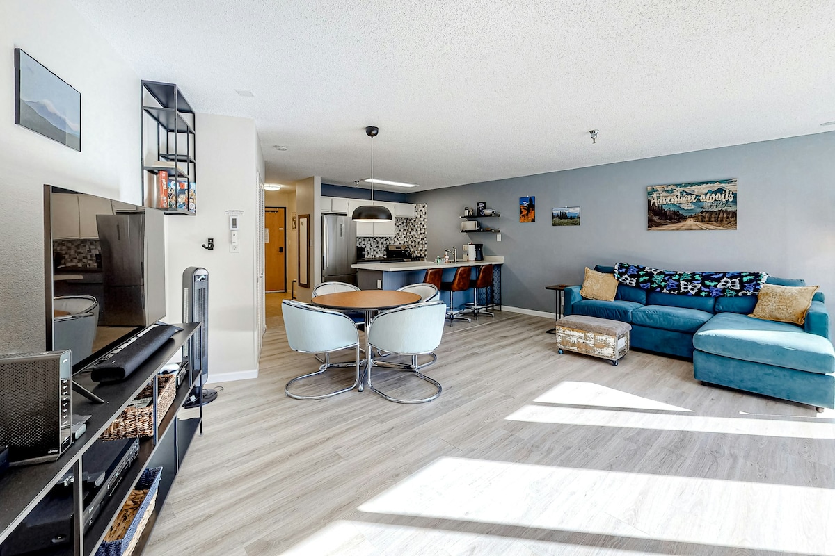 You'll feel right at home at the hearth of this updated condo. You'll be on the slopes in 2 bus stops with pickup just outside. On Main Street, across from Cooper Creek and the Rendezvous Event Center, the town awaits. Host family style feasts with the fully equipped kitchen and dine up to nine. Relax in the hot tubs, on the huge couch by the big screen digital cable TV with streaming services, on the deck and in the hot tubs. Decadent Cal King bed in master. Ski lockers.