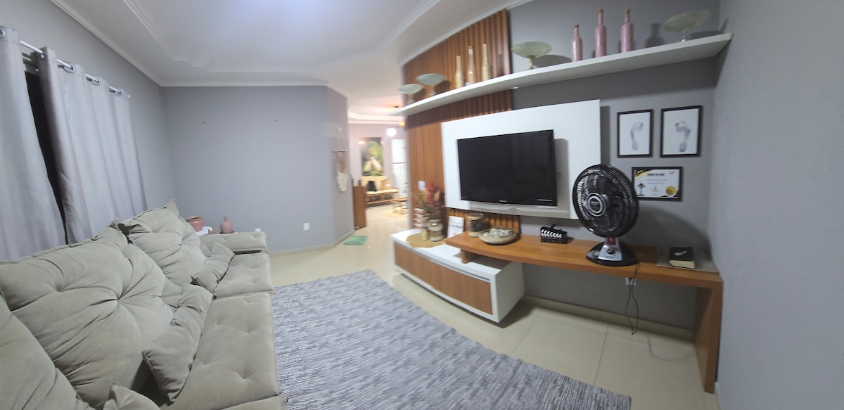 Relaxe com toda a família nesta acomodação tranquila 3 quartos sendo 01 suíte, sala, banheiro social, cozinha, área de serviço, área de lazer com churrasqueira, ofurô com aquecimento e hidromassagem 🚙🛻Vaga de garagem para até 3 carros pequenos ou 2 carros grandes 1 cama super King 2 camas casal 1 sofá reclinável/retrátil Ar condicionado em todos os quartos e no espaço de lazer Jogue os seus jogos de videogame na TV com Smart Hub e controle (necessário possuir conta) 🛜 Wi-Fi 300mb