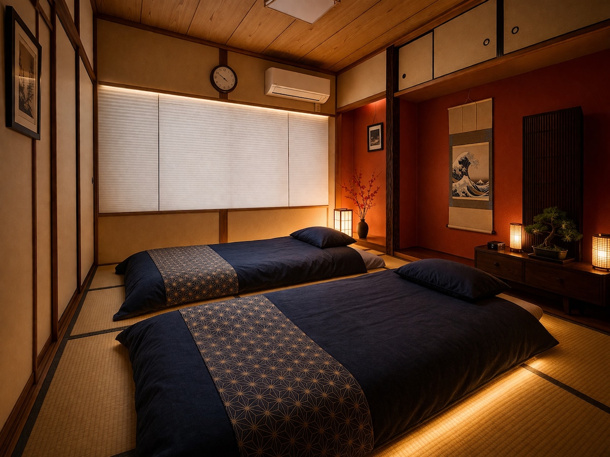 Just one stop from the city’s rush, yet quietly removed from its noise — Reikyo presents a serene tatami room designed for rest, reflection, and quiet beauty. Facing a small private garden, this space blends traditional Japanese style with modern comfort. The courtyard garden is softly lit at night, creating a meditative mood that shifts with the time of day. Washi-style lighting, natural wood textures, and the soft scent of tatami create a tranquil retreat in the heart of the city.