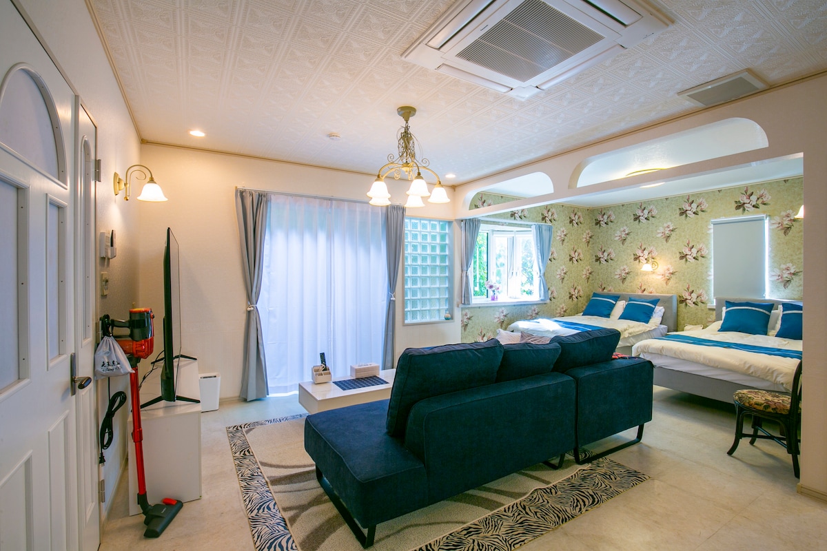 青森文化会館並びの123㎡、テラスにウッドデッキがあるテラススイートです。 セミダブルベッド2台(キングサイズ)のある寝室が2つ、敷布団を敷いて頂く寝室が2つで最大大人9名様まで宿泊可能。乳幼児は無料、46㎡のキッチン・リビングスペースにはフルキッチン・3口のIH・大型冷蔵庫を完備。75インチの4k大型テレビ。高速インターネット完備、卓球台(フルサイズ)、ワーキングスペース、大型洗濯機完備。無料駐車2~3台分完備ですのでグループにも最適。3世帯の家族旅行に最適です。ベビーガード・ベビーチェア・ベビーベッドも完備。 ねぶた会場まで徒歩5分。専用テラスでは八甲田山を見ながらアフタヌーンティーやBBQをお楽しみいただけます。