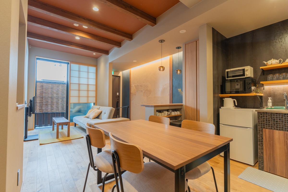 京町家貸切宿「高瀬川七条」は築115年の京町家をフルリノベーションした宿泊施設です。京都の美しい風景を形作る京町家を、当時の構造を残したまま、京都特有の蒸し暑い夏、底冷えの厳しい冬にも快適にお過ごしいただけるよう、気密性・断熱性能の高い建物に仕立て直しました。 1階の和室からは『露地』(※茶室へ通じる庭)をイメージした坪庭をご覧いただくことができます。また、廊下にはゆったりとくつろぎながら坪庭を眺めることができるようソファをご用意しました。夜にはライトアップされた坪庭を眺めながら、癒しの時間をお過ごしいただけます。 2階には寝室が2部屋あり、シングルベッド2台の部屋とダブルベッド1台の部屋をご用意しました。 5名様以上でご宿泊の場合は、少しご面倒ですが1階の和室にお布団を敷き、寝室としてご利用いただきます。 キッチンには簡単なお料理ができるよう調理器具と食器のご用意がございます。